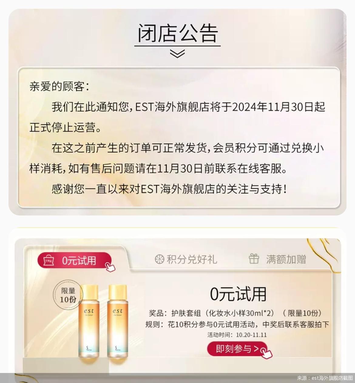 EST在其发布的《闭店公告》中表示:“亲爱的顾客!我们在此通知您,EST海外旗舰店将于2024年11月30日起正式停止运营。”