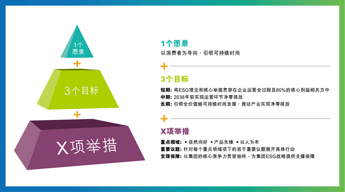 财报期内,波司登制定“1+3+X”ESG战略框架,明确“以消费者为导向,引领可持续时尚”的ESG愿景,并设立“到2038年前实现运营环节净零排放”的目标及过程中的阶段性目标。