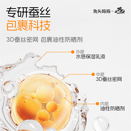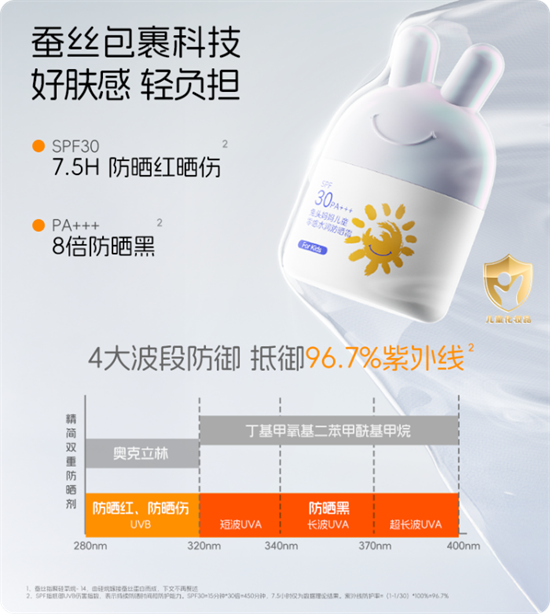 此外,品牌也通过技术创新解决安全性与肤感问题。如儿童品牌兔头妈妈今年推出的化学防晒新品通过蚕丝包裹科技,把传统的化学防晒剂,通过蚕丝蛋白进行包裹处理,在不影响防晒剂的紫外吸收效果前提下,使其变成大粒径的水溶液,实现安全性的同时保证产品温和性和肤感轻盈。