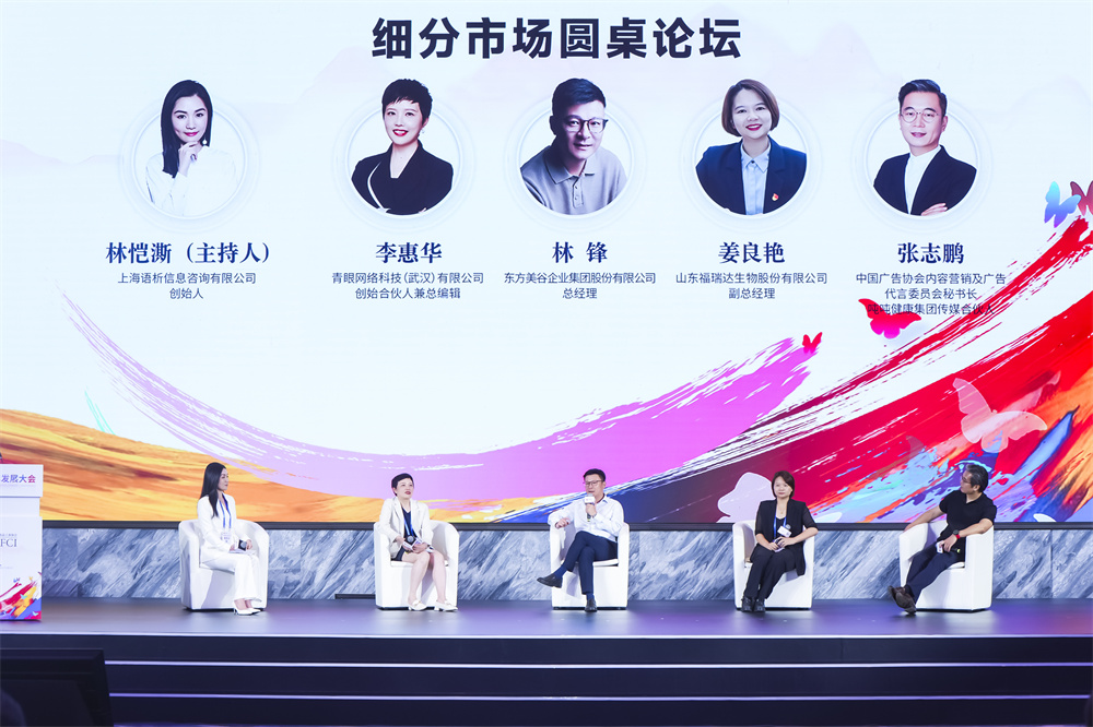 上海语析信息咨询有限公司创始人林恺澌,东方美谷企业集团股份有限公司党委副书记、总经理林峰,山东福瑞达生物股份有限公司副总经理姜良艳,青眼网络科技(武汉)有限公司 创始合伙人兼总编辑李惠华,中国广告协会内容营销及广告代言委员会秘书长、吨吨健康集团传媒合伙人张志鹏从产业链不同环节切入,共同探讨中国香妆品牌下一个增长极。