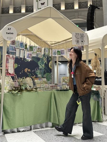 2024年10月,赵庆秋参加武汉“过森日”市集,在摊位前。