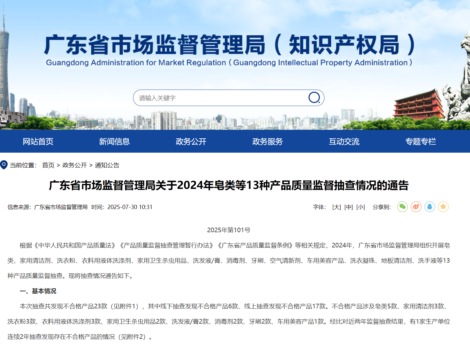 根据《中华人民共和国产品质量法》《产品质量监督抽查管理暂行办法》《广东省产品质量监督条例》等相关规定,2024年,广东省市场监督管理局组织开展皂类、家用清洁剂、洗衣粉、衣料用液体洗涤剂、家用卫生杀虫用品、洗发液/膏、消毒剂、牙刷、空气清新剂、车用美容产品、洗衣凝珠、地板清洁剂、洗手液等13种产品质量监督抽查。现将抽查情况通告如下。