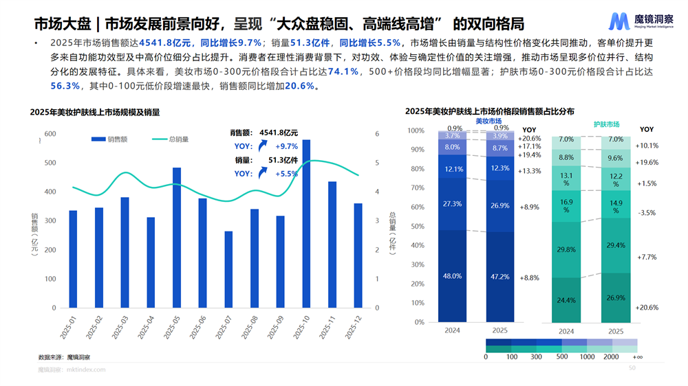 在颜值经济与悦己潮流的持续驱动下,2025年美妆护肤线上市场量价齐升,全年销售额达4541.8亿元,同比增长9.7%,销量51.3亿件,同比增长5.5%。市场呈现鲜明的“大众盘稳固、高端线高增”双向格局,100元以下价位段以20.6%的增速领跑大盘,1000元以上高端线亦增长亮眼,消费分层加速、升级与分级并行。