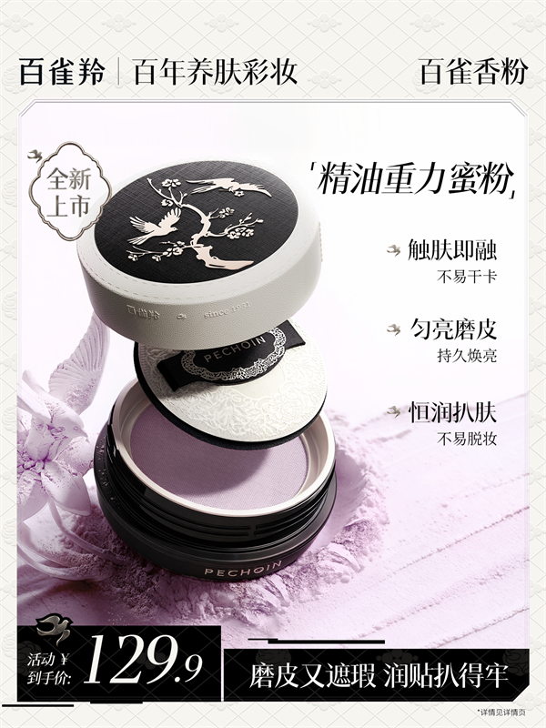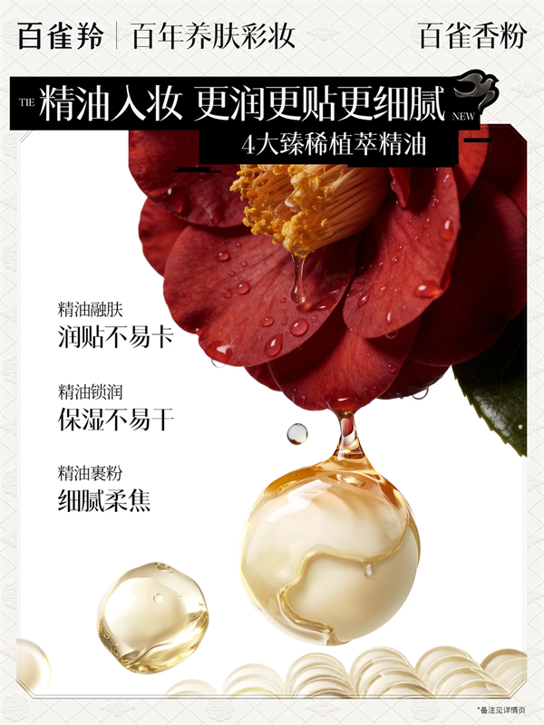 传统蜜粉的痛点在于“干”和“卡”。养肤成分(如精油、提取物)与粉体质感天然矛盾:加了养肤成分容易结块、飞粉;追求粉质细腻又牺牲了滋养效果。为此,百雀羚研发团队首创「精油重力粉」技术,以精油包裹粉体,实现绵软糯的羊绒般触感,上脸不易飞粉,同时达到24小时润感持妆,兼具防蹭、防水、防汗的稳定表现。这一技术突破,让养肤与妆效不再互相妥协。