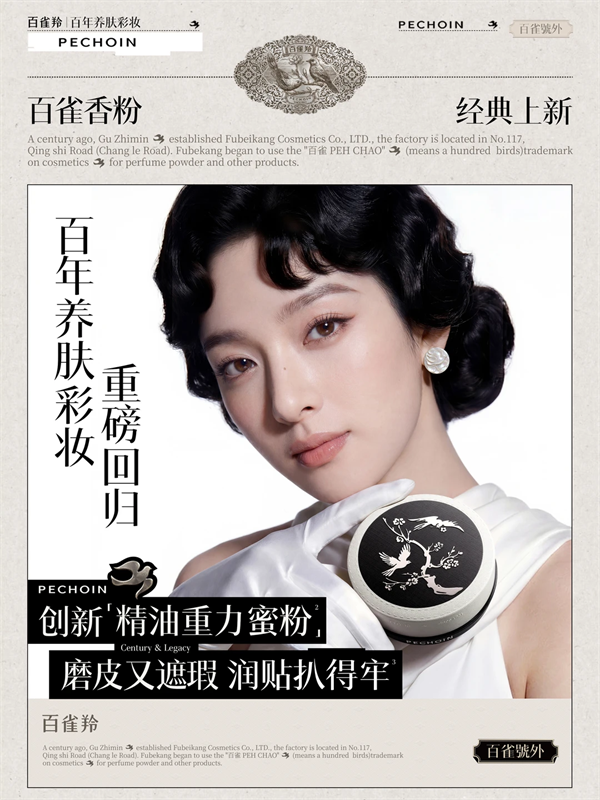 回望历史脉络,百雀羚的彩妆基因并非外向跨界,而是品牌原点。1931年,品牌创始人顾植民先生于上海长乐路创立百雀羚,率先探索出“妆养合一”的东方路径。同年推出“百雀香粉”,复刻自古籍中的“龙胆珍珠养肤配方”,以精油入妆、珍珠养颜,开创了中国养肤彩妆的先河。彼时,这款产品便成为阮玲玉、周璇等民国名伶的钟爱之选。