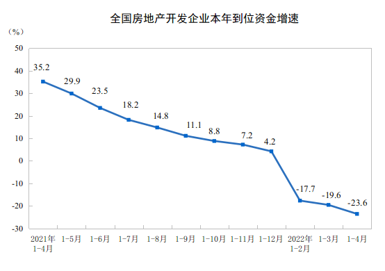 1—4月份,房地产开发企业到位资金48522亿元,同比下降23.6%。其中,国内贷款6837亿元,下降24.4%;利用外资38亿元,增长129.4%;自筹资金16271亿元,下降5.2%;定金及预收款15357亿元,下降37.0%;个人按揭贷款8037亿元,下降25.1%。