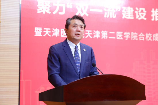 校长郝继辉在致辞中对各级领导、各界朋友长期以来对天津医科大学的关心与支持表示衷心的感谢!他从天津医学院、天津第二医学院兴建讲起,回顾了天津医学院天津第二医学院合校成立天津医科大学及30年以来发展的光辉历程。他指出,合校成立天津医科大学为学校抢抓国家战略发展机遇,乘势而上,实现跨越式发展打下了坚实基础。成立天津医科大学后,学校坚持以一流学科引领一流大学建设,落实立德树人根本任务,打造高水平师资队伍,矢志勇攀学术高峰,服务人民健康福祉,1996年成为天津市唯一的国家“211工程”重点建设市属院校,进入新时代,连续两轮入选国家“双一流”建设高校,在波澜壮阔的历史画卷中留下了熠熠生辉的发展烙印。