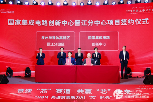 《国家集成电路创新中心晋江分中心项目》签约仪式上,泉州半导体高新区管委会副主任、晋江分园区主任林嘉达,国家集成电路创新中心常务副总经理沈晓良上台签约。新华网发