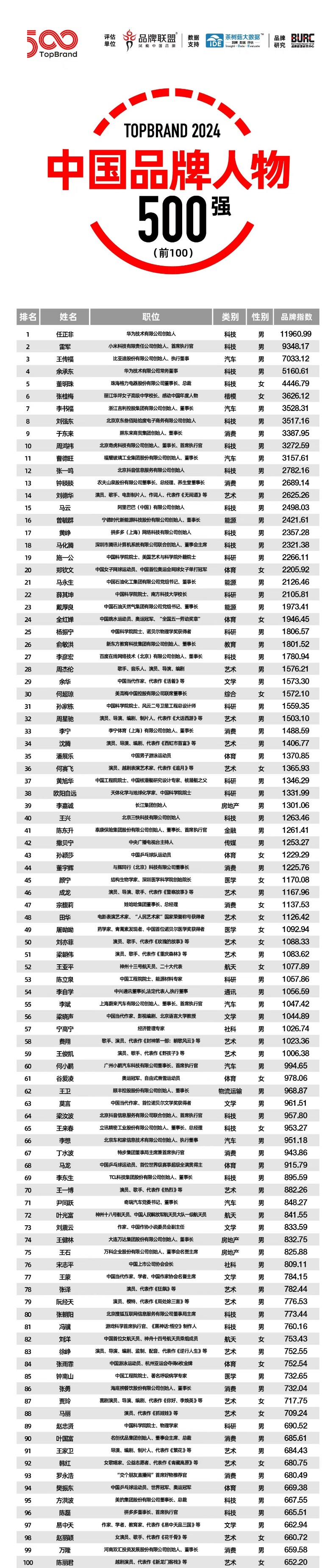 该份榜单显示,任正非、雷军、王传福被评为《TopBrand 2024中国品牌人物500强》前三甲。余承东、董明珠、张桂梅、李书福、刘强东、于东来、周鸿祎分居4-10名。