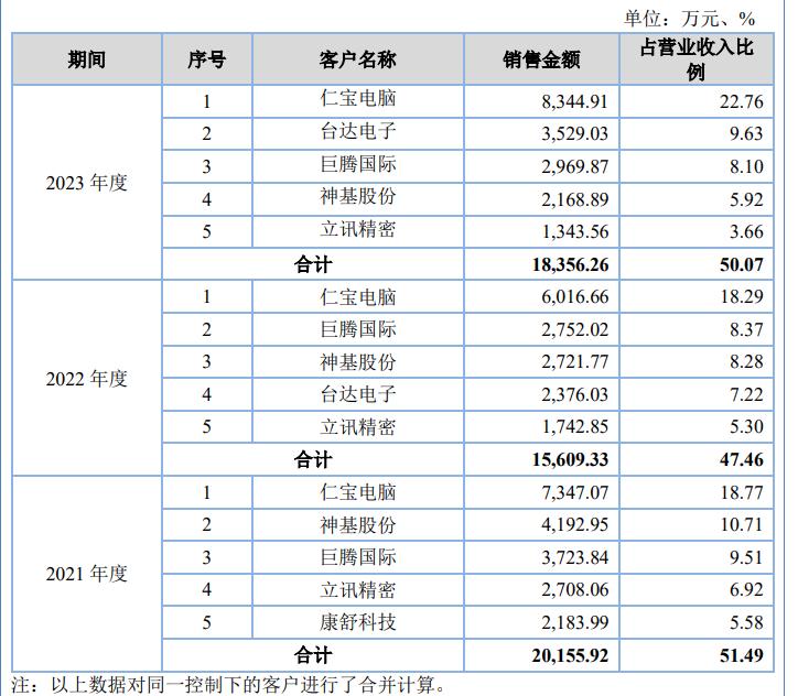 2022年,由于消费电子行业整体需求下降,使得仁宝电脑及巨腾国际向公司的采购额有所减少;2023年,由于公司获取了较多仁宝电脑生产新机种所需产品的采购订单,同时仁宝电脑通过巨腾国际等组件生产商向公司采购,公司对两家主要客户的销售收入增加。