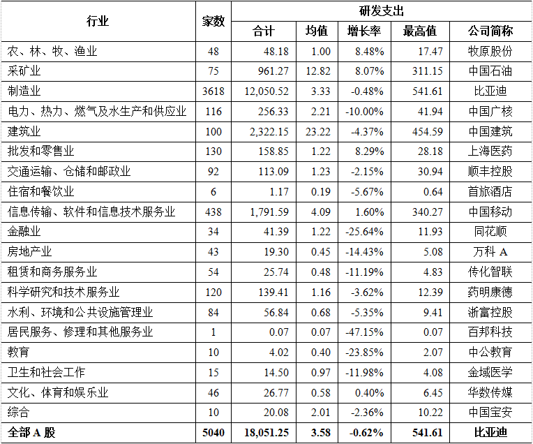 5402家上市公司中共有5040家披露了其研发支出数额,总研发支出为18051.25亿元,较上年降低0.62%,平均研发支出为3.58亿元。2856家实现了研发支出正增长,其中261家研发支出增长率高于50%。