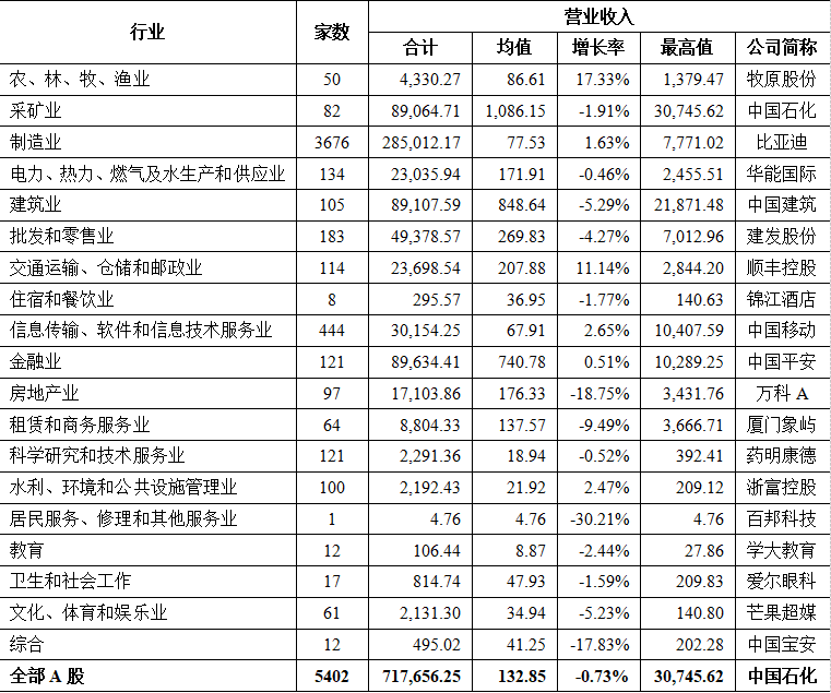 表1 2024年A股上市公司营业收入分行业统计表(金额单位:亿元)
