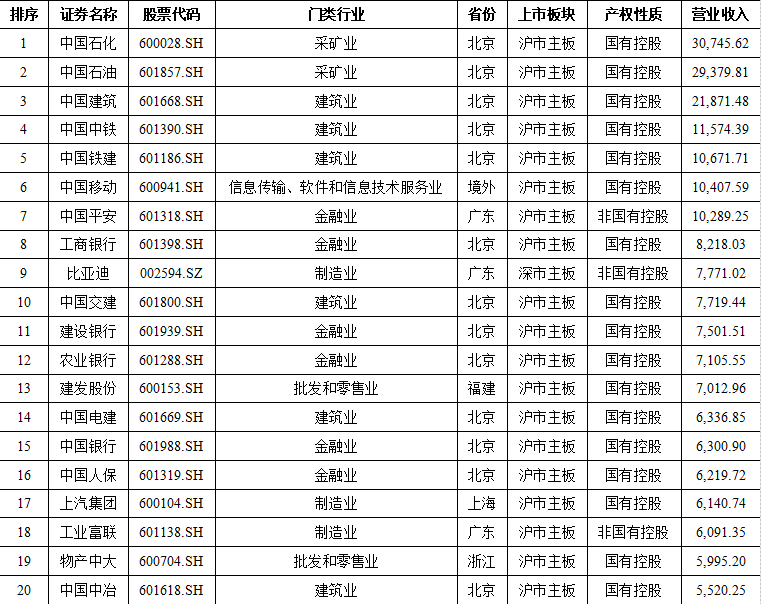 从营业收入排名看(见表2),营业收入最高的上市公司为中国石化(600028.SH),2024年实现营业收入30745.62亿元,其次是中国石油(601857.SH)和中国建筑(601668.SH),分别为29379.81亿元和21871.48亿元。从产权性质看,营业收入排名前20的上市公司中17家为国有控股企业,3家为非国有控股企业;从板块分布看,营业收入排名前20的上市公司中19家来自沪市主板,1家来自深市主板;从省份分布看,营业收入排名前20的上市公司中13家来自北京,3家来自广东,福建、上海、浙江和境外各1家;从行业分布看,营业收入排名前20的上市公司中,建筑业和金融业各有6家,制造业3家,采矿业,批发和零售业各有2家,信息传输、软件和信息技术服务业有1家。