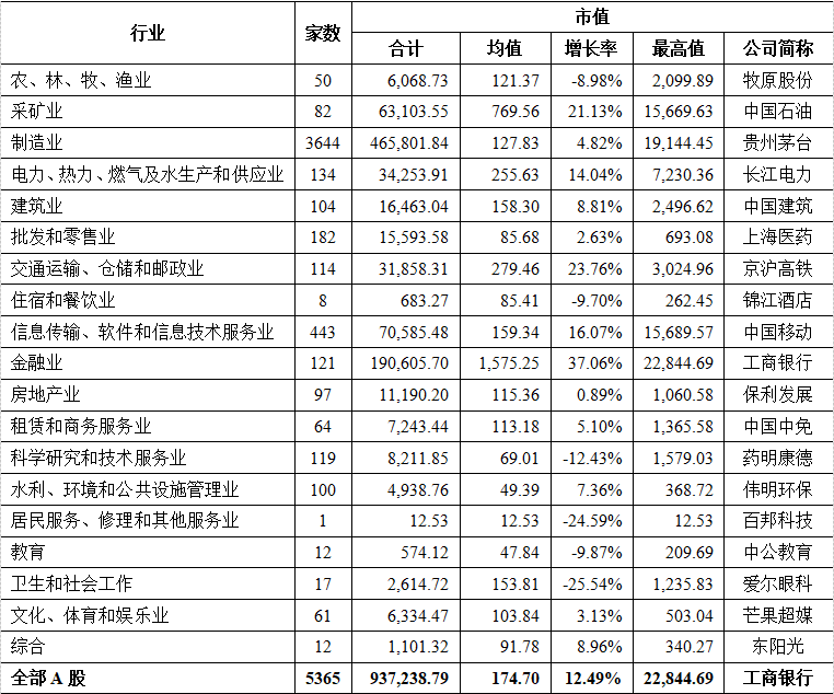 从市值整体规模看,市值合计最高的行业为制造业,为465801.84亿元,其中计算机、通信和其他电子设备制造业(103420.12亿元),电气机械和器材制造业(59238.82亿元),医药制造业(38665.01亿元),专用设备制造业(38418.00亿元),酒、饮料和精制茶制造业(38148.15亿元)贡献较高,上述5个细分行业市值合计占制造业总市值的59.66%;其次为金融业(190605.70亿元),信息传输、软件和信息技术服务业(70585.48亿元)。从市值平均规模看,市值均值最高的行业为金融业,为1575.25亿元;其次为采矿业(769.56亿元),交通运输、仓储和邮政业(279.46亿元),电力、热力、燃气及水生产和供应业(255.63亿元)。从市值规模增长看,19个证监会门类行业中13个行业增长率为正,市值增长率最高的行业为金融业,为37.06%;其次为交通运输、仓储和邮政业(23.76%),采矿业(21.13%)。