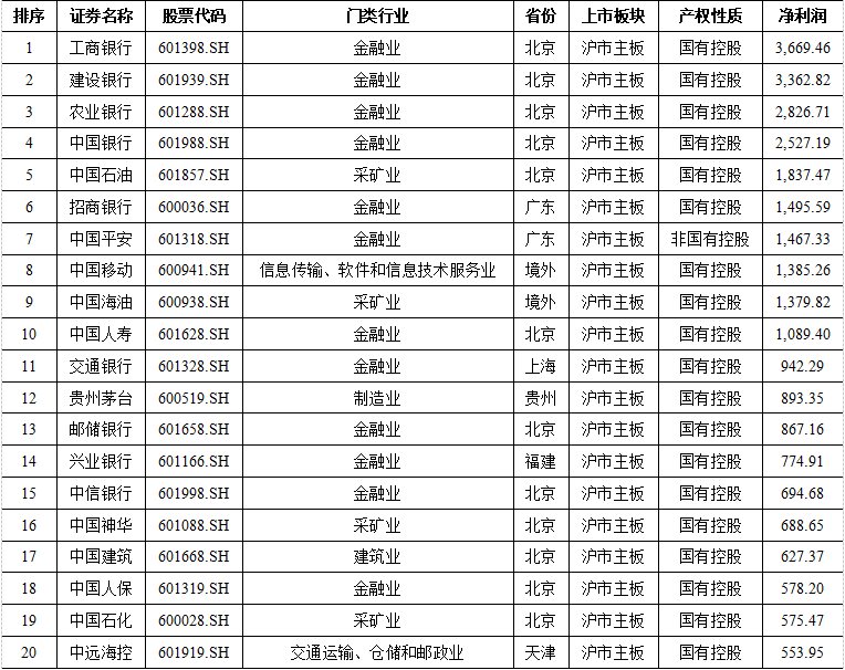 从净利润排名看(见表4),净利润最高的上市公司为工商银行(601398.SH),2024年实现净利润3669.46亿元,其次是建设银行(601939.SH)和农业银行(601288.SH),分别为3362.82亿元和2826.71亿元。从产权性质看,净利润排名前20的上市公司中19家为国有控股企业,1家为非国有控股企业;从板块分布看,净利润排名前20的上市公司全部来自沪市主板;从省份分布看,净利润排名前20的上市公司中12家来自北京,广东和境外各2家,上海、贵州、福建和天津各1家;从行业分布看,净利润排名前20的上市公司中12家来自金融业,采矿业4家,建筑业,交通运输、仓储和邮政业,制造业,信息传输、软件和信息技术服务业各有1家。
