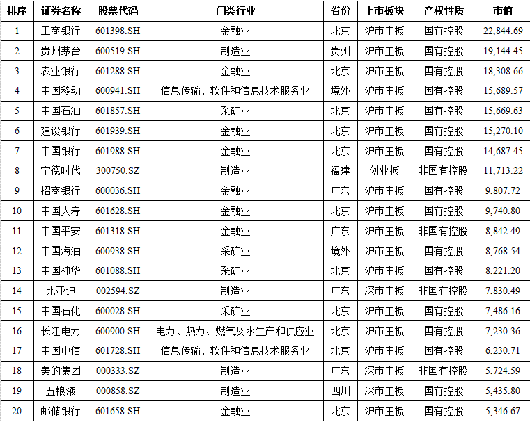 表8 2024年A股上市公司市值排名前20(金额单位:亿元)