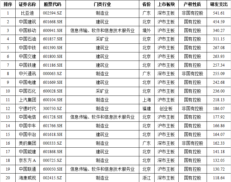 从研发支出排名看(表6),研发支出最高的上市公司为比亚迪(002594.SZ),2024年实现研发支出541.61亿元,其次是中国建筑(601668.SH)和中国移动(600941.SH),分别为454.59亿元和340.27亿元。从产权性质看,研发支出排名前20的上市公司中16家为国有控股企业,4家为非国有控股企业;从板块分布看,研发支出排名前20的上市公司中14家来自沪市主板,5家来自深市主板,1家来自创业板;从省份分布看,研发支出排名前20的上市公司中13家来自北京,3家来自广东,上海、浙江、福建和境外各1家;从行业分布看,研发支出排名前20的上市公司中8家来自制造业,建筑业7家,信息传输、软件和信息技术服务业3家,采矿业2家。