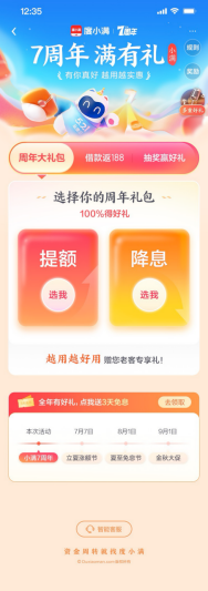 老客户所能享受到的周年福利则更为优厚。在用户回馈日之际,度小满推出了“周年大礼包”、“借款返188”、“抽奖赢好礼”三项活动。度小满为老客户送上周年大礼包,涨额度、降价格,价格相当于打了8折。