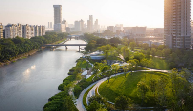 花园里绿树成荫,400多颗乔木如碧波般高低起伏,乔木平均年龄超18岁,最长者树龄已近50年,花园里还有全广东最大的麻楝树,高约15m、重量20吨、树冠投影近60平,放眼望去整个花园绿意盎然,如置身森林公园般惬意。而移目花园之外,广州母亲河珠江之水被“引入”园区,衍生出超2万方的滨水公园,形成CBD稀缺的亲水驳岸,紧邻滨水公园则是利用地势高差特点打造的近1万方中轴绿廊,如绿带一般在花园、水岸、社区、商业间游动……