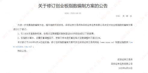 新修订的方案为创业板指新设了个股权重上限,即在每次定期调整时,单只样本股的权重占比将被控制在20%以内。