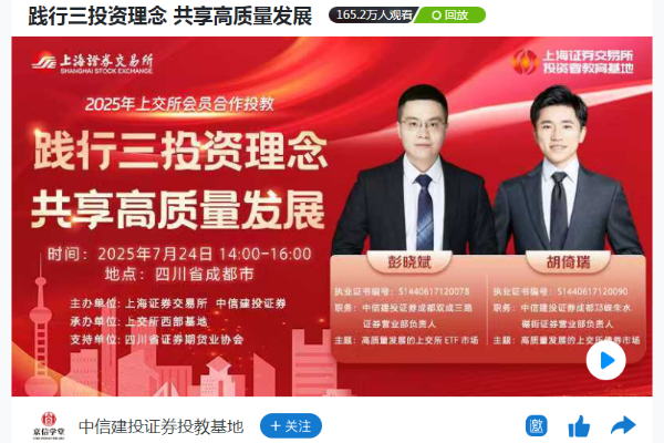 为深入贯彻落实上海证券交易所(以下简称“上交所”)投资者教育工作部署,切实保护中小投资者合法权益,2025年7月24日,由上交所与中信建投证券联合主办,上交所西部基地、中信建投证券四川分公司联合承办的“践行三投资理念 共享高质量发展”会员合作投教活动,在上交所西部基地圆满举办,本次活动得到了四川省证券期货业协会的大力支持。活动采用了“线上+线下”相结合的形式,充分利用网络、新媒体等方式开展宣传,吸引了80余名投资者亲临现场,并通过网络直播达到了超过165万人次的观看,显著提升了投教知识传播的深度和广度。
