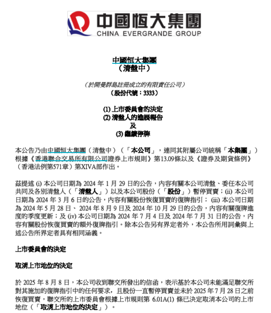 8月12日晚间,在香港上市的中国恒大发布公告称,公司于2025年8月8日收到香港联交所发出的信函,表示基于公司未能满足联交所对其施加的复牌指引中的任何要求,且股份一直暂停买卖并未于2025年7月28日之前恢复买卖,香港联交所上市委员会根据相关上市规则,已决定取消公司的上市地位。