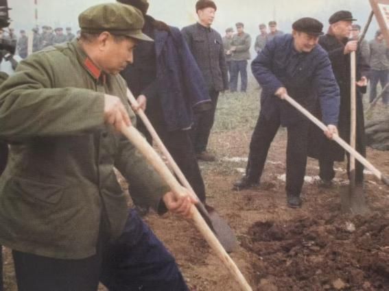武汉市汉口城区1983年7月间发生两次暴雨。治水刻不容缓,为支援黄孝河排渍工程建设,原武汉军区空军党委主动请缨,抽调4000多名指战员与武汉市人民一起,经过5个冬春的艰苦奋斗,根治了黄孝河隐患。图为原武汉军区空军政委康星火(左一)在施工现场挥锹铲土。