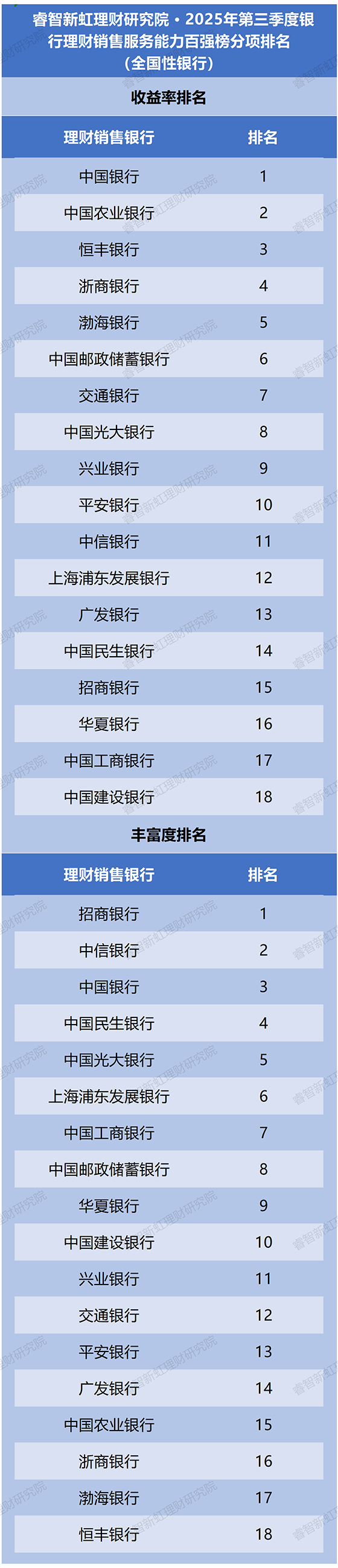 表2 2025年第三季度银行理财销售服务能力百强榜分项排名(全国性银行)