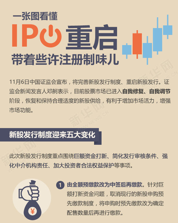 新华网北京11月6日电(记者 屈绍辉)6日中国证监会宣布,将完善新股发行制度重启新股发行。证监会相关负责人表示,此次改革重点围绕解决巨额资金打新、简化发行审核条件、强化中介机构责任、加大投资者合法权益保护等事项,这是新股发行体制改革的进一步深化,朝着股票注册制改革的方向又迈出了坚实的一步。