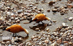 | 2月15日,两只野鸭子在甘肃兰州新桥一带裸露出的黄河河滩上觅食。由于黄河流域来水量比往年同期减少48%,黄河上游各大水库蓄水量比上年减少近20亿立方米。
