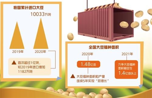 据了解,2021年我国将继续实施大豆振兴计划,稳定大豆种植面积,力争大豆播种面积稳定在1.4亿亩以上,提高单产和品质,确保用于豆制品等的食用大豆国内自给。