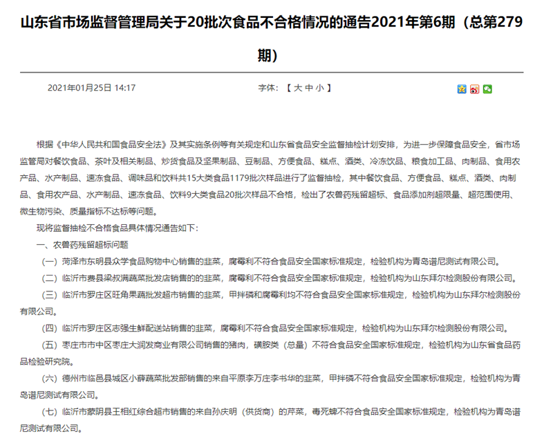 1月25日,山东省市场监督管理局发布关于20批次食品不合格情况的通告2021年第6期(总第279期)(以下简称:通告)。山东省市场监管局对餐饮食品共15大类食品1179批次样品进行了监督抽检,其中餐饮食品、方便食品、糕点、酒类、肉制品、食用农产品、水产制品、速冻食品、饮料9大类食品20批次样品不合格,检出了农兽药残留超标、食品添加剂超限量、超范围使用、微生物污染、质量指标不达标等问题。