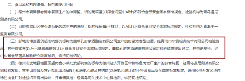 通告显示邹城市博贵百货超市销售的标称为曲阜孔府家酒酿造有限公司生产的府藏浓香型白酒,经青岛市华测检测技术有限公司检验发现,其中甜蜜素(以环己基氨基磺酸计)不符合食品安全国家标准规定。曲阜孔府家酒酿造有限公司对检验结果提出异议,并申请复检;经山东省食品药品检验研究院复检后,维持初检结论。