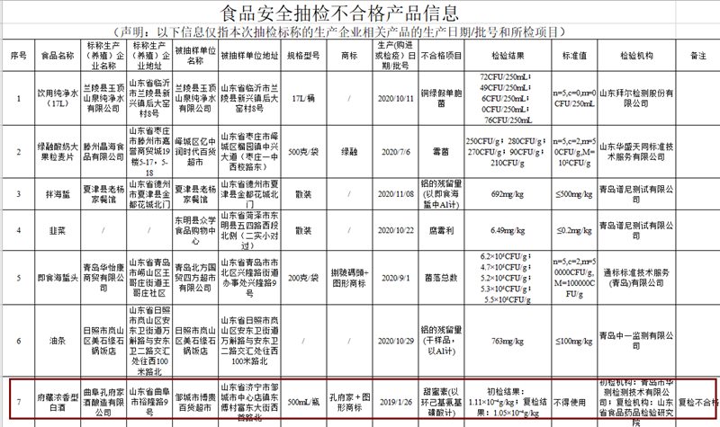 通告附件显示,不合格批次为府藏浓香型白酒标称由曲阜孔府家酒酿造有限公司生产,由邹城市博贵百货超市销售,规格型号为500mL/瓶,商标为孔府家,生产(购进或检疫)日期/批号为2019/1/26。不合格项目为甜蜜素(以环己基氨基磺酸计),初检结果为1.11×10g/kg,复检结果为1.05×10g/kg,标准值为不得使用,复检不合格。初检机构为青岛市华测检测技术有限公司,复检机构为山东省食品药品检验研究院。