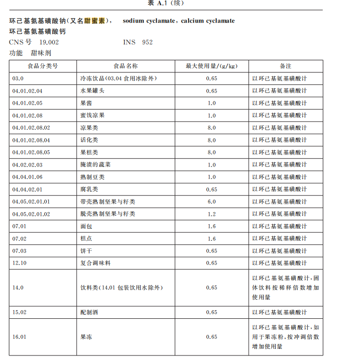科普中国显示,甜蜜素,其化学名称为环己基氨基磺酸钠,是食品生产中常用的添加剂。我国《食品添加剂使用卫生标准》(GB 2760-2014)规定:甜蜜素在水果罐头、果冻、冷饮、复合调味料、配制酒等食品中的最大使用量为0.65g/kg,在面包、糕点、方便米面食品中的最大用量为1.6g/kg,在果酱、蜜饯、熟制豆类等食品中的最大用量为1.0g/kg,在果糕类、凉果类食品中的最大用量为8.0g/kg,在坚果类食品中的最大用量包括1.2g/kg(脱壳类)和6.0g/kg(带壳类)两种。除上述食品外,其他食品一律不得添加甜蜜素。