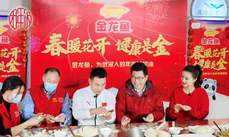 益海嘉里武汉分公司总经理陈文全带领廖辉等热心人士,在金龙鱼营养健康体验馆里,用金龙鱼专业饺子粉包起了饺子。期间,嘉宾们还为包饺子比起了赛,奥运会冠军和抗疫市民代表互不服输,随着紧张的比赛和愉快的谈笑下,一只只胖乎乎,晶莹剔透的饺子放满了砧板。包完以后志愿者们还将饺子和慰问品送到福利院,大家一起向全国人民拜年。