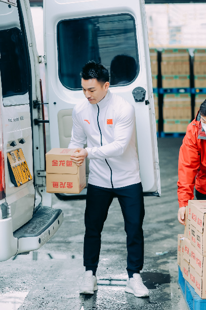 (湖北籍奥运冠军廖辉为新年春节搬运粮油物资)