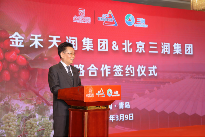 参加此次签约仪式的中共中央宣传部原秘书长官景辉指出,金禾天润集团和北京三润集团顺应农业产业发展规律,优化产业布局,完善利益联结机制,让农民更多分享产业增值收益。两家集团的合作方向正确,道路一致,符合党和国家乡村振兴的大战略,符合农村农民的意愿和利益,是一件共同发展、互利共赢的好事。相信金禾天润集团与北京三润集团的深入合作,一定能够加快大樱桃、大葡萄的科技化、产业化、规模化发展,真正成为具有竞争力和影响力的国家民族品牌企业。在国家乡村振兴伟大工程中做出更大贡献。
