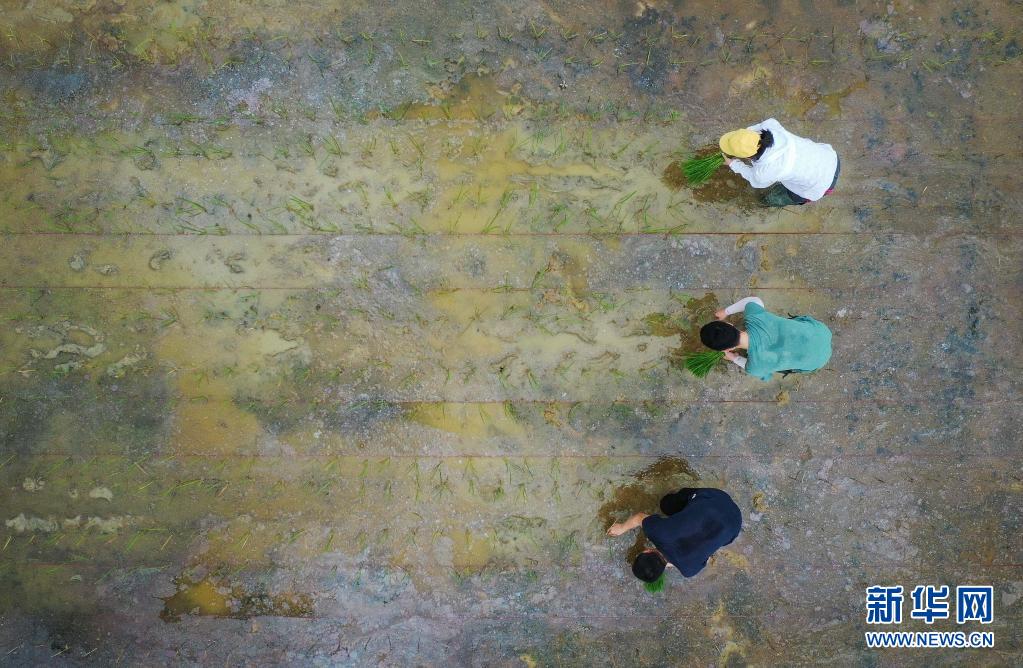 研究人员在广州增城华南农业大学试验田插种嫦娥五号搭载的太空稻秧苗(2021年3月29日摄,无人机照片)。共计40克的“天稻”于2020年11月搭乘嫦娥五号登月,历时约23天、76万公里的“环月旅行”返回地球。