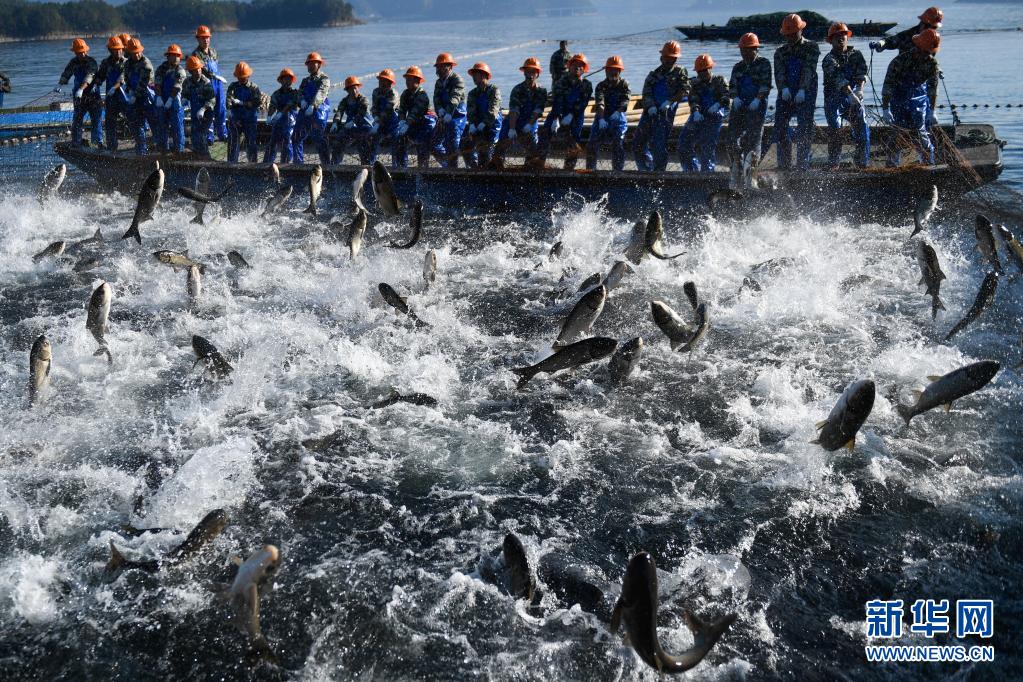 捕捞队员在千岛湖进行巨网捕鱼(2018年11月28日摄)。近年来,千岛湖以渔业为基础,建立了集“养殖、管护、捕捞、销售、加工、烹饪、旅游、文创”为一体的完整产业链,获得经济效益和生态效益的双丰收。