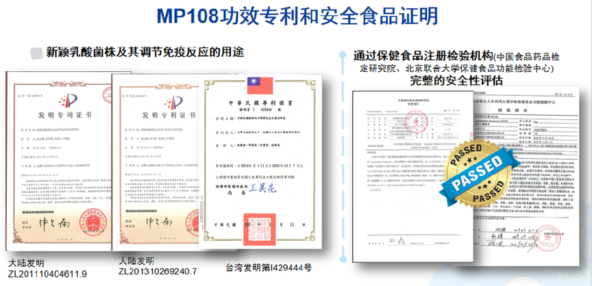 MP108分离自中国健康婴幼儿肠道,历经10年潜心研究,6层严苛筛选,透过不同耐受性和功能性平台试验,最终在1000多菌株中精选而出,成为锦旗生物集团五大明星菌株之一,自2015年起,锦旗生物研发团队即针对MP108规划了系列严苛试验,从体外到动物体内再到人体临床,仅人体临床研究这一项目,便耗费6年近900人的临床循证。主要功效为预防小儿轮状病毒肠炎、特异性皮炎、肠道手术后肠道菌群影响、过敏性鼻炎等。目前MP108已发布专利3项、发表学术论文9篇,其中SCI发表2篇,并通过保健食品注册检验机构的安全性评估的等一系列检测,获欧洲食品安全局QPS的安全菌种论证及台湾可用食品原料一览表正面表列。