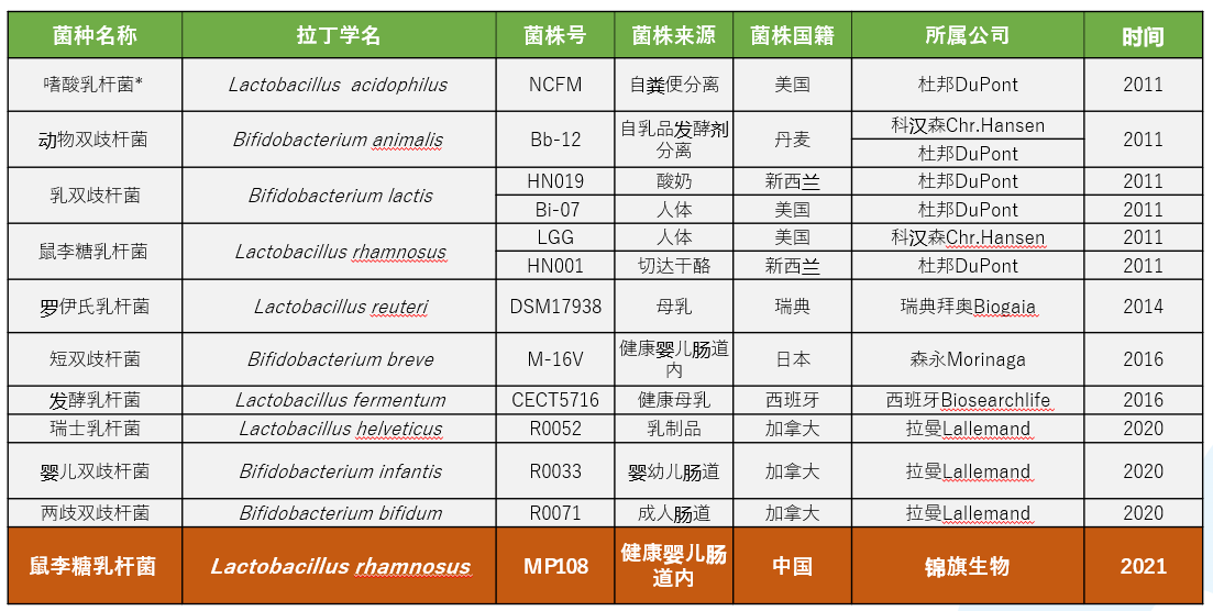 4月25日,国家卫生健康委发布正式公告,批准由锦旗生物集团申报的MP108鼠李糖乳杆菌(Lactobacillus rhamnosus MP108)为新食品原料,菌株原料的食品安全指标合乎我国相关标准,可用于婴幼儿食品中的菌种。此前,可用于婴幼儿食品中的菌株知识产权主要来源于欧美等国。锦旗生物的MP108为中国第一株自主研发菌株,正式打破了婴幼儿“洋菌株”的垄断,中国婴幼儿益生菌菌株本土化发展至此取得突破性进展。