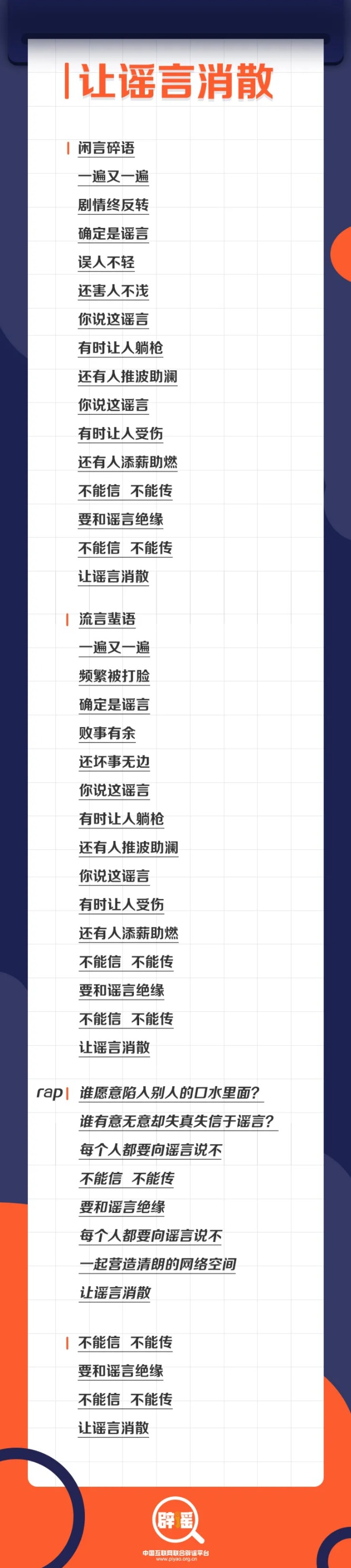 在中央网信办开展“聚辟谣之力 扬文明之光”系列主题宣传活动和中国互联网联合辟谣平台成立三周年之际,中央网信办举报中心、中国互联网发展基金会、中国互联网联合辟谣平台于9月3日发布“聚辟谣之力 扬文明之光”主题MV《让谣言消散》。