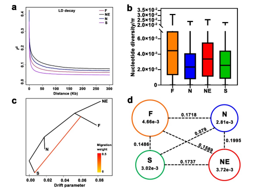 前人主要通过野生李种质资源考察、孢粉学研究以及大规模表型分析等手段推测中国李起源于我国南方长江流域。本研究则以‘中李6号’高质量基因组为参考,进行全基因组高深度重测序数据分析,共鉴定到3,380,659个高质量SNPs(单核苷酸多态性位点),将74份中国李核心种质聚类为南、北、东北及国外品种群,南方品种群较为原始,遗传多样性丰富,且与其他品种群间存在基因交流,从遗传学层面再次证实我国南方长江流域为中国李原始驯化中心。
