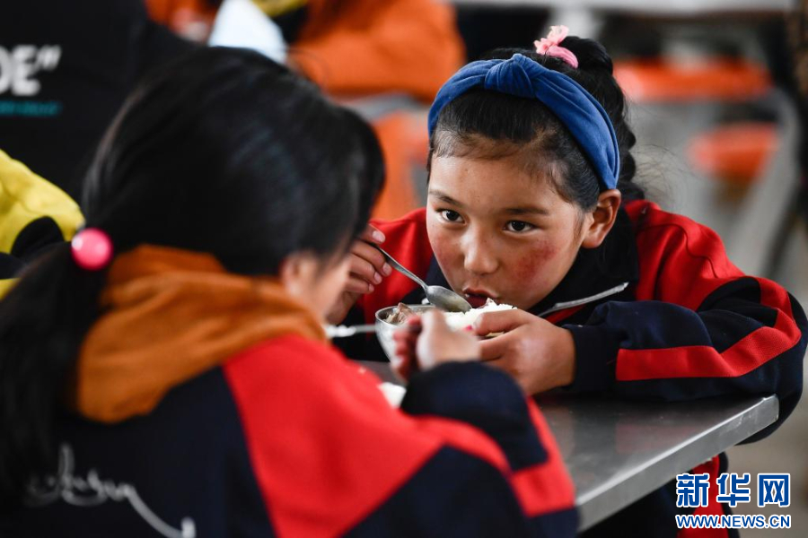 青海省果洛藏族自治州甘德县岗龙乡中心寄宿制小学的学生在食堂吃饭(3月17日摄)。新华社记者 张龙 摄