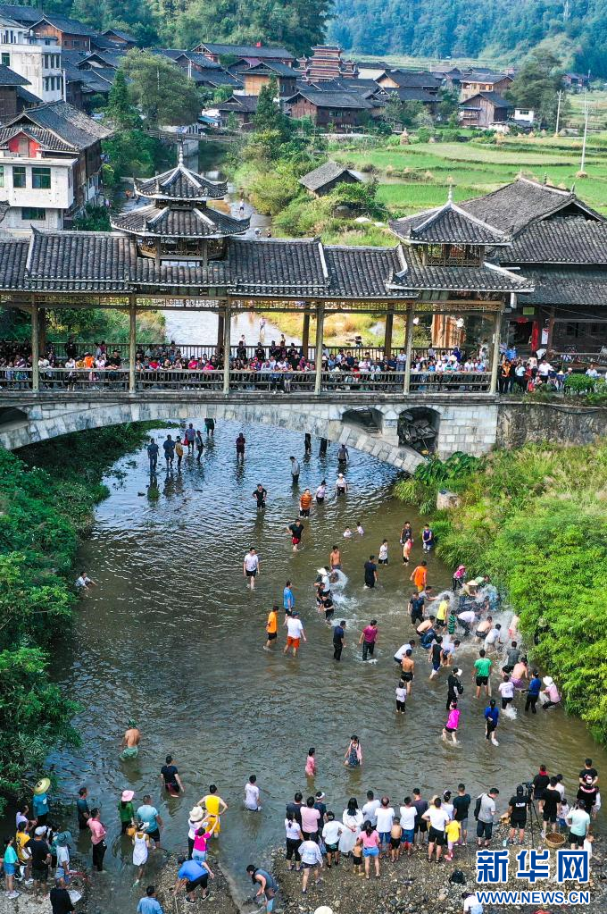 10月2日,在贵州省剑河县太拥镇昂英村,游客和村民参加抓鱼比赛(无人机照片)。 当日,贵州省黔东南苗族侗族自治州剑河县太拥镇昂英村举办“开鱼节”活动,村民和游客通过抓鱼比赛、跳芦笙舞、长桌宴等形式,庆祝苗寨丰收,欢度国庆假期。 新华社记者 杨文斌 摄pagebreak