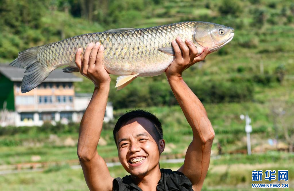 10月2日,在贵州省剑河县太拥镇昂英村,游客在展示抓鱼比赛中抓到的大鱼。 当日,贵州省黔东南苗族侗族自治州剑河县太拥镇昂英村举办“开鱼节”活动,村民和游客通过抓鱼比赛、跳芦笙舞、长桌宴等形式,庆祝苗寨丰收,欢度国庆假期。 新华社记者 杨文斌 摄pagebreak