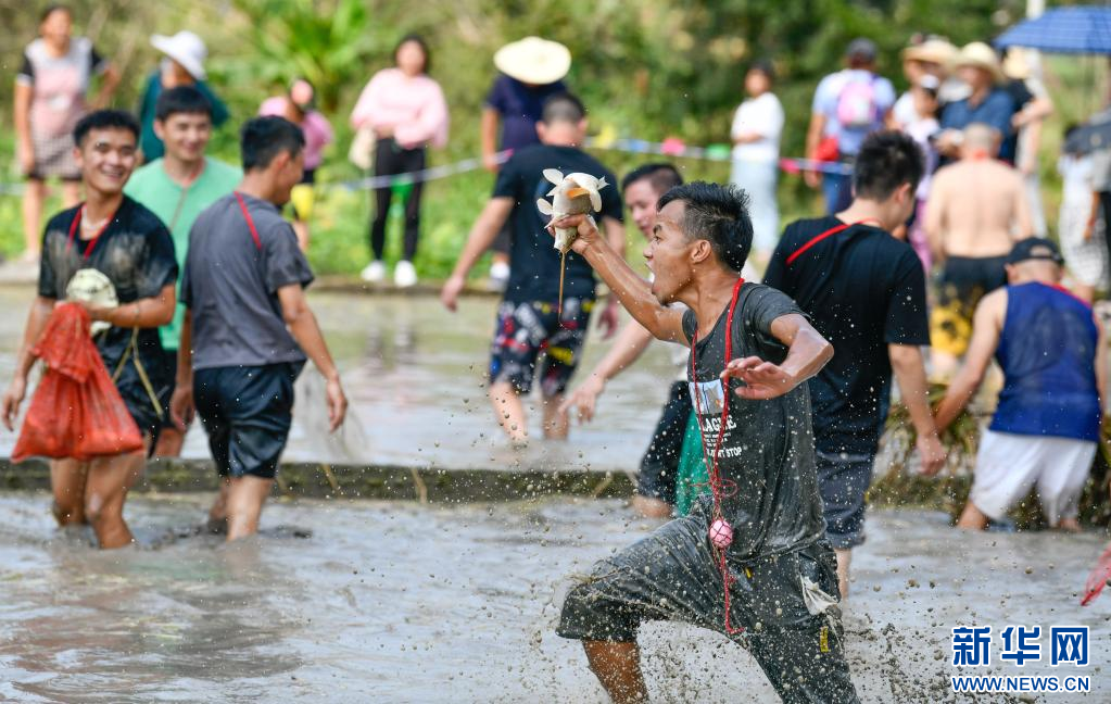 10月2日,在贵州省剑河县太拥镇昂英村,游客和村民参加抓鱼比赛。 当日,贵州省黔东南苗族侗族自治州剑河县太拥镇昂英村举办“开鱼节”活动,村民和游客通过抓鱼比赛、跳芦笙舞、长桌宴等形式,庆祝苗寨丰收,欢度国庆假期。 新华社记者 杨文斌 摄pagebreak