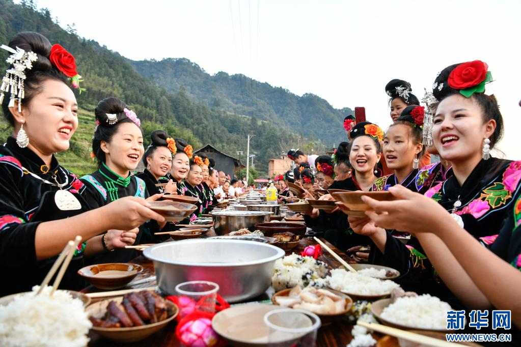 10月2日,在贵州省剑河县太拥镇昂英村,游客和村民在吃长桌宴。 当日,贵州省黔东南苗族侗族自治州剑河县太拥镇昂英村举办“开鱼节”活动,村民和游客通过抓鱼比赛、跳芦笙舞、长桌宴等形式,庆祝苗寨丰收,欢度国庆假期。 新华社记者 杨文斌 摄