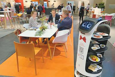 在科隆食品展上,中国企业研发的送餐机器人吸引了观众的目光。